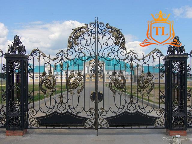 Mẫu cổng sắt mỹ nghệ đẹp, phù hợp với những căn biệt thự lớn, hiện đại. Màu sơn giả đồng đen tôn lên vẻ bề thế và đắng cấp cho ngôi nhà.